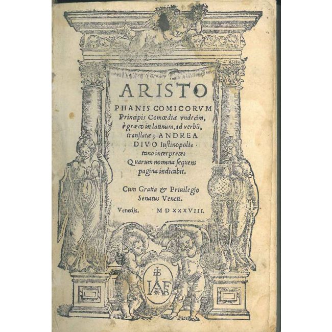 In 16°, 16 cm, antica e modesta legatura in pergamena, dorso in carta marmoizzata con etichetta manoscritta, c. 260. Marca tipografica in cornice architettonica al frontespizio, l'ultima carta è stata ristampata di recente su carta antica, e ha al recto il colophon e al verso una grande marca tipografica. Iniziali decorate. Si tratta della prima versione latina delle commedie di Aristofane a cura di Andrea Divo. Leggero alone ai tagli lontano dal testo a poche pagine, alcune bruniture a 10 carte
