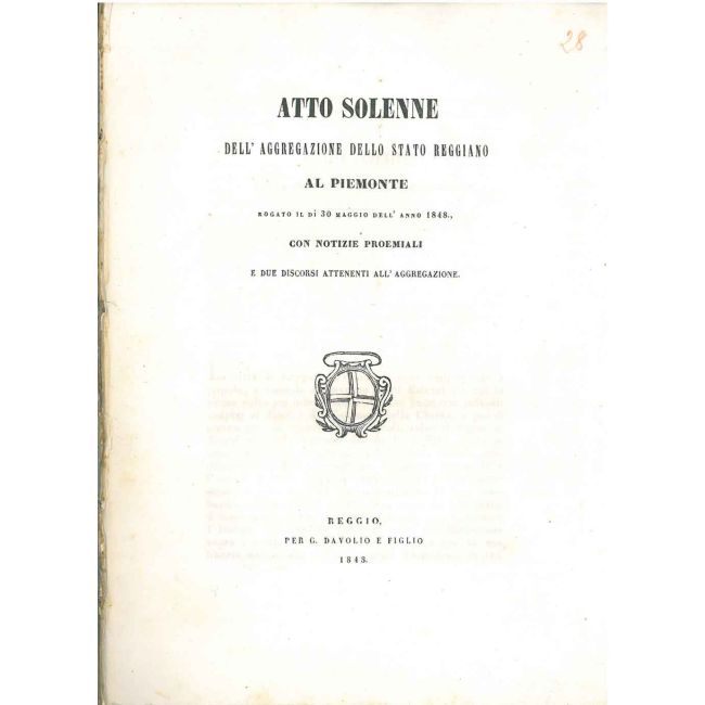 Atto solenne dell'aggregazione dello stato reggiano al Piemonte rogato il di 30 maggio dell'anno 1848. Con notizie proemiali e due discorsi attenenti all'aggregazione