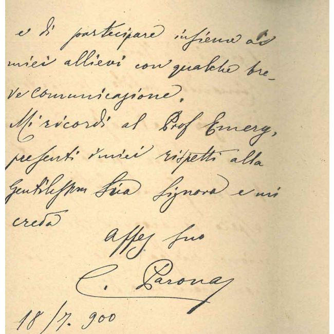 9x11 cm, 13 righe autografe e firmate di adesione al convegno e invio della relativa quota di £ 1. Infine "Saluti al Prof. Emery" |