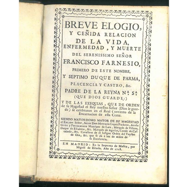 Breve elogio, y cenida relacion de la vida, enfermedad y muerte del serenissimo senor Francisco Farnesio, ... Duque de Parma, Placencia y Castro, &c., padre de la Reyna N.a S.a, ... y de las exequias que ... se celebraron en el real convento de la Encarnacion de esta Corte, siendo mayordomo mayor de su Magestad el exc.mo señor Mercurio Lopez Pacheco ..