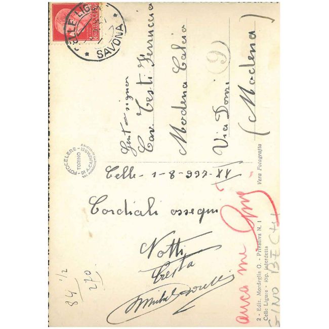 inviata a Ferruccio Testi con, tra le altre, la firma autografa di Gino Bechi a pastello rosso "anca me Gino" |