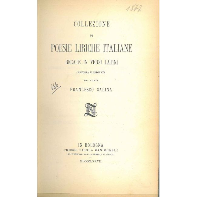 20 cm, rilegatura coeva in mezza tela, decorazioni a secco ai piatti; pp. viii, 344; macchia all'ultima copertina |