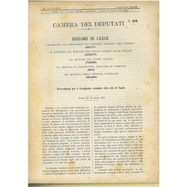 Disegno di legge: Provvedimenti per il risorgimento economico della città di Napoli. 24 marzo 1904 (Giolitti, Luzzatti, Orlando e altri) |