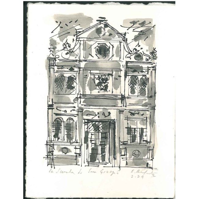 13x16 cm, 12x9 cm, la parte disegnata. Il disegno è a china e acquerello, titolo manoscritto a matita: "La scola di San Giorgio" e firma autografi di Bonfante