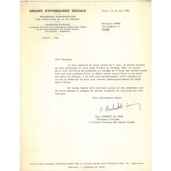 27x21 cm, complessivamente 24 righe dattiloscritte in francese inviate ad un sociologo italiano in cui de Lauwe si mostra interessato ai suoi studi e ad una possibile collaborazione con il "collettivo di architettura di Milano"