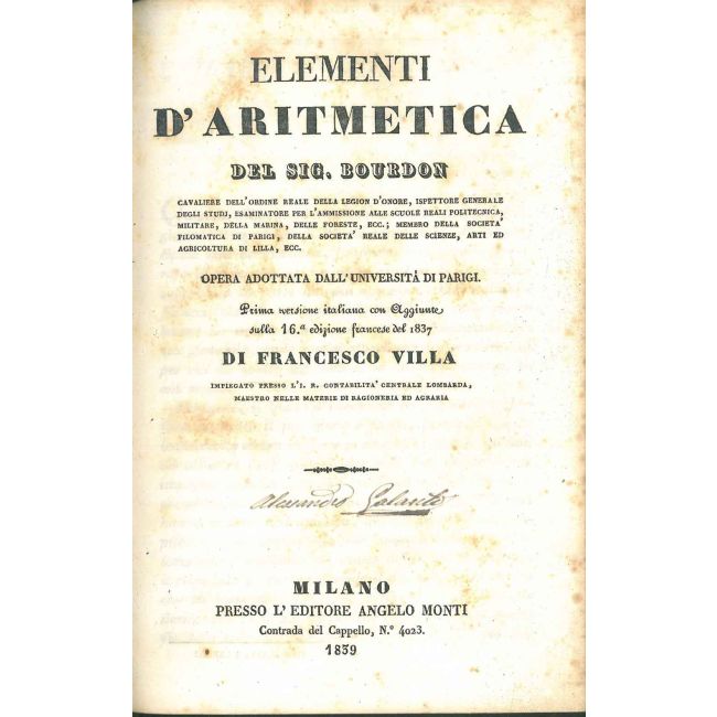 Elementi d'aritmetica, prima versione italiana con aggiunte sulla 16° edizione francese del 1837 di Francesco Villa