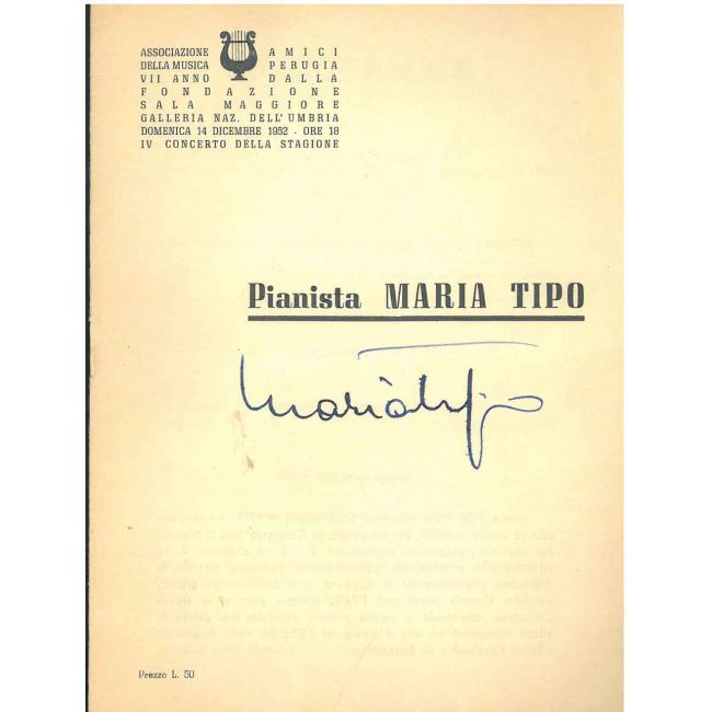 Firma autografa della celebre pianista alla copertina del programma di sala del concerto 14 dicembre 1952 per l'Associazione Amici della Musica di Perugia