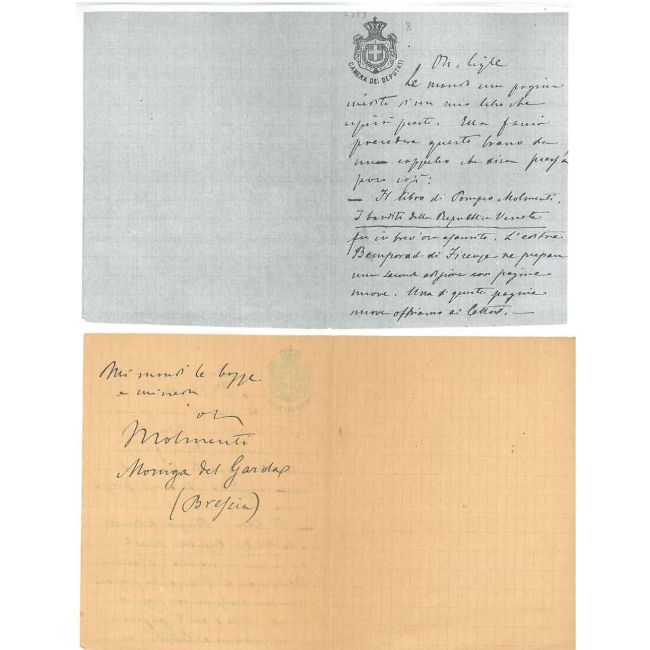 Senza data, 10x13 cm; "... il libro di Pompeo Molmenti Il bandito della Repubblica Veneta fu in brev'ore esaurito. L'editore Bemporad di Firenze ne prepara una seconda edizione con pagine nuove. una di queste pagine offriamo ai lettori" ... 18 righe autografe e firmate da Molmenti