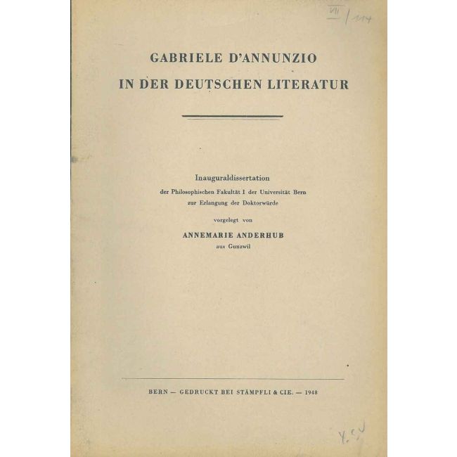 Gabriele d'Annunzio in der deutschen Literatur. Inaugural dissertation der Philosophischen Fakultat I der Universitat Bern zur Erlangung der Doktorwurde vorgelegt von Annemarie Anderhub