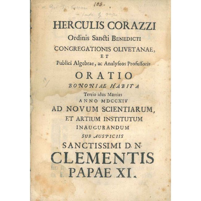 Hercules Corazzi ordinis Sancti Benedicti congregationis olivetanae et publici algebrae, ac analyseos professoris oratio bononiae habita tertio idus martias anno MDCCXIV ad novum scientiarum et artium institutum inauguranduum sub auspiciis sanctissimi D. N. Clementis Papae XI