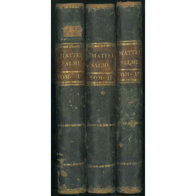 3 voll, 19 cm, rilegature coeve in mezza pelle verde con angoli, fregi in oro ai dorsi e titoli impressi in oro su tassello, piatti marmorizzati, p. XXXI, 327; 375; 301. Numerose testatine, finalini e capolettera xilografati. Piccoli forellini di tarlo alle prime 12 pagine del primo volume con minima perdita di lettere. Ordinari segni del tempo ai dorsi, interni molto ben conservati.