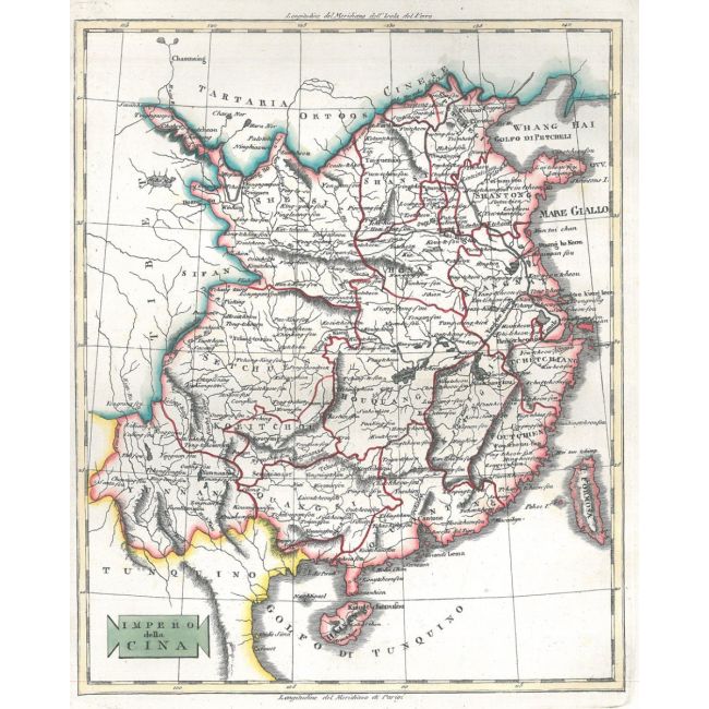carta geografica calcografica colorata a mano 24,5 x 19,8 cm su foglio 29 x 21,5 cm. Bella carta della Cina e dell'isola di Formosa (Taiwan) con i confini acquarellati. Assai ben conservata.