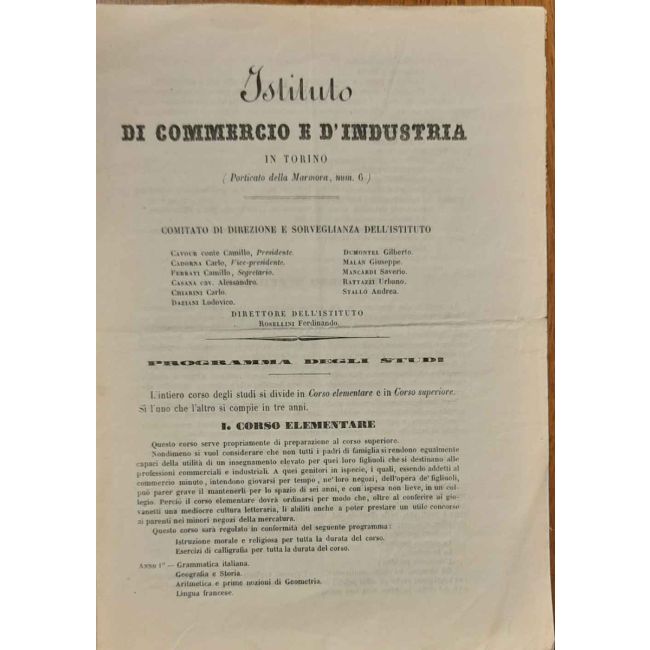 24x17,5 cm, p. 4 con obiettivo dei corsi e programmi. Tra gli altri, nel Comitato di Direzione e Sorveglianza dell'Istituto: Cavour, Cadorna, Rattazzi, Ferrati ed altri