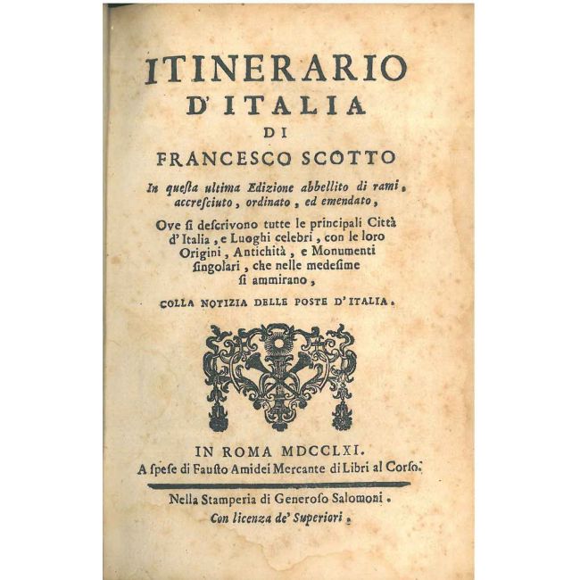 | descrizione | in 8°, (18x11,5 cm), antica rilegatura in pergamena, titolo manoscritto al dorso; 1 c.b, pp. xii, 419 (1); incisione allegorica all'antiporta, vignetta incisa al frontespizio, 26 tavole ripiegate fuori testo (aperte 17,5x22 cm). Le carte rappresentano nell'ordine: Roma, carta geografica del'Italia, Trento, Venezia, Padova, Vicenza, Verona, Brescia, Milano, Parma, Bologna, Firenze, Lucca, Livorno, Siena, Civitavecchia, Genova, Mantova, Ferrara, Urbino, Ancona, Loreto, Napoli, Pozzuoli, Bacoli, Cuma |