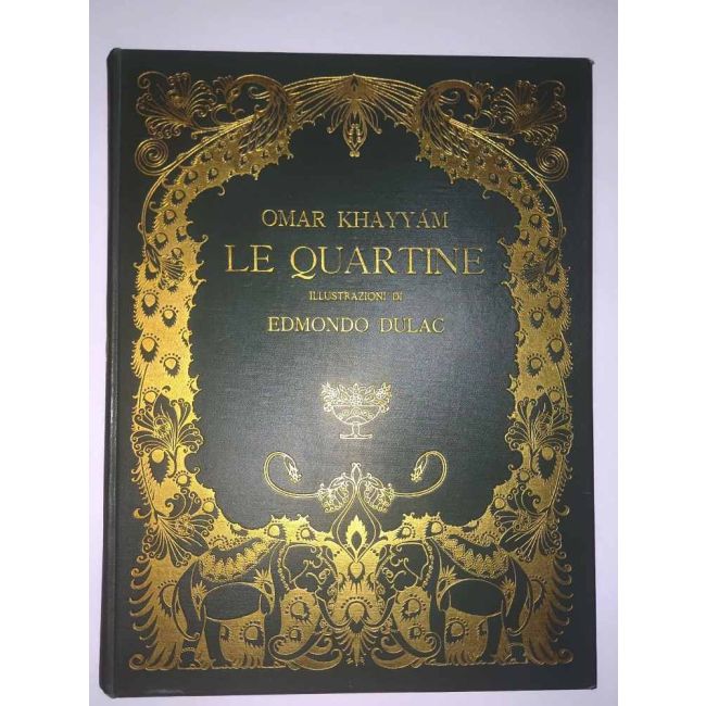 | descrizione | 28 cm. in 4°, rilegatura editoriale in tela verde, ricchi fregi e titoli in oro al piatto e dorso tagli superiori in oro, 120 pagine non numerate con 101 quartine prese dalla traduzione inglese di Fitzgerald del "Rubaiyat of Omar Khayyam", 20 splendinde tavole fuori testo a piena pagina, con le illustrazioni di Edmond Dulac applicate su cartoncino entro cornice editoriale litografica in oro e protette da carta velina con la quartina di riferimento a stampa. Frontespizio litografico, testo incorniciato e pagine stampate solo al recto. Esemplare senza data, quasi certamente pubblicato attorno al 1910 (cfr. Iccu). Ottimo stato di conservazione con minimi ingiallimenti limitatamente a pochi cartoncini di supporto alle tavole. Prima edizione italiana. |