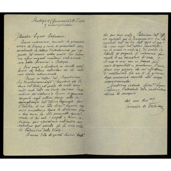 | descrizione | 17,5x10 cm, lettera di 4 facciate, due manoscritte in chiara grafia in cui lo storico dell'arte Fabriczy chiede al professore... il materiale relativo al restauro della Palazzina della Viola di Bologna eseguito sotto la sorveglianza dell'Ufficio Regionale per L'Emilia. La finalità è renderne conto ai lettori del Repertorium fur Kunstwissenschaft con il quale lo scrivente collabora |