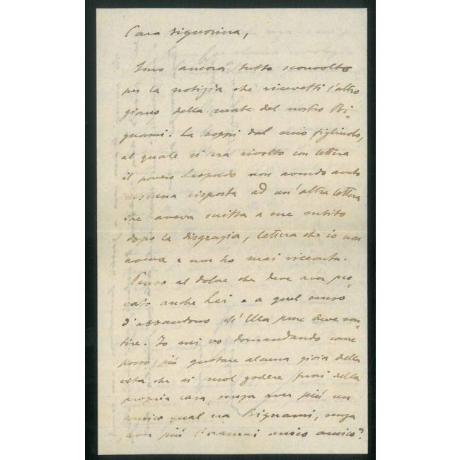 18x11 cm, doppio foglio di lettera in fitta scrittura: "Sono ancora tutto sconvolto per la notizia che ricevetti l'altro giorno della morte del nostro Bignami..."