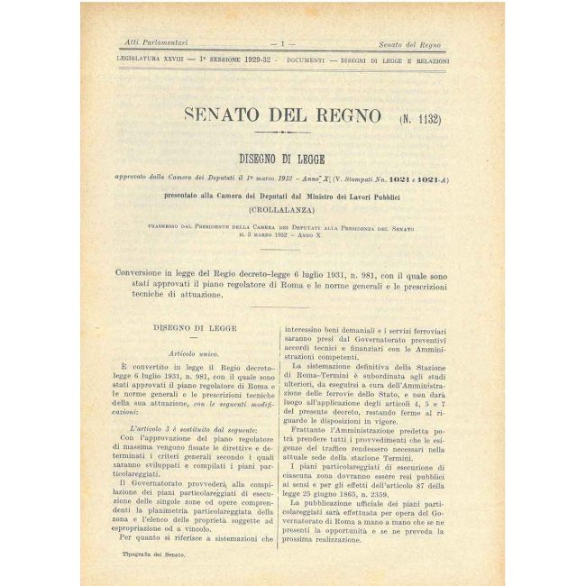 Disegno di legge: Conversione in legge del Regio decreto-legge 6 luglio 1931, n. 981, con il quale sono stati approvati il piano regolatore di Roma e le norme generali e le prescrizioni tecniche di attuazione