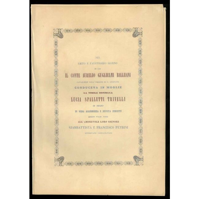 | titolo | Nel lieto e faustissimo giorno in cui il conte Aurelio Guglielmi Balleani... conduceva in mogli la nobil donzella Lucia Spalletti Trivelli |