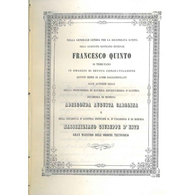 Nella generale letizia per la ricuperata sanità dell'augusto sovrano estense Francesco Quinto si tributano in omaggio di devota congratulazione questi sensi di animi racconsolati alle altezze reali della principessa di Baviera arciduchessa d'Austria duchessa di Modena Adelgonda Augusta Carolina