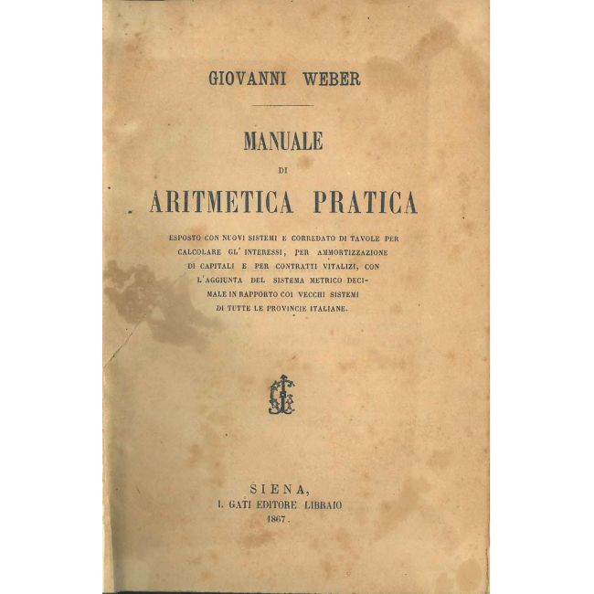 Manuale di aritmetica pratica esposto con nuovi sistemi e corredato di tavole per calcolare gl'interessi, per ammortizzazione di capitali e per contratti vitalizi, con l'aggiunta del sistema metrico decimale in rapporto coi vecchi sistemi di tutte le provincie italiane