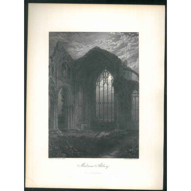 | descrizione | Incisione su acciaio, impronta 27 x 19 cm, su foglio 31,5 x 23,5. Le rovine dell'Abazia di Melrose (Scozia). Tratto da "Picturesque Europe" 1875-1879. Esemplare assai ben conservato. |