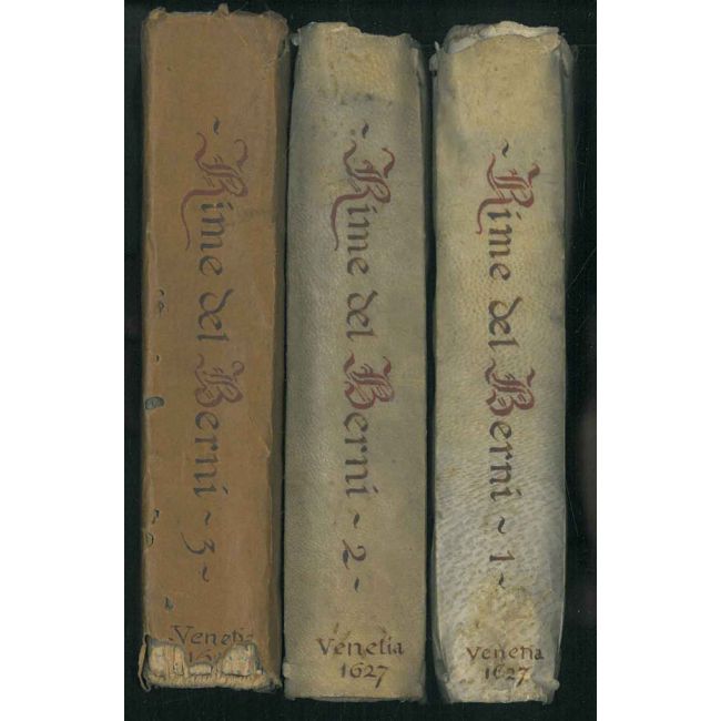 in 12°, 3 volumi su 4, 13 cm, rilegatura coeva in pergamena, titolo manoscritto al dorso; cc. (12), 180; (12), 192; (12), 204. Qualche tarletto, mancanze e tracce del tempo alle legature