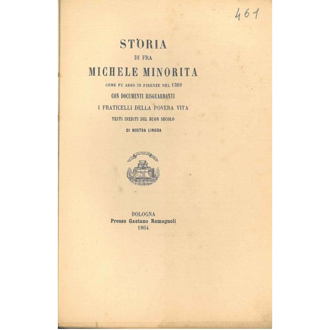 Storia di Fra Michele Minorita come fu arso in Firenze nel 1389 con documenti risguardanti i fraticelli della povera vita. Testi inediti del buon secolo di nostra lingua. Scelta di curiosità letterarie inedite o rare dal secolo XIII al XIX