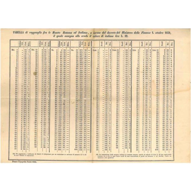 | titolo | Tabella di ragguaglio fra le Monete Romana ed Italiana a norma del decreto del Ministero delle Finanze il quale assegna allo scudo il valore di italiane lire 5. 32 |