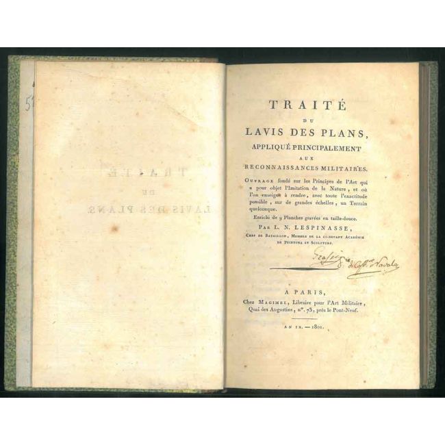 | descrizione | 21 cm, rilegatura coeva in mezza pelle con titolo e fregi in oro impressi al dorso, segnalibro in tessuto, p. (2), 159, (2). In appendice 9 belle tavole incise su rame e più volte ripiegate con esempi di disegno cartogrsafico e paesaggistico ad uso militare. Firmetta di possesso al frontespizio. Testo in francese. |